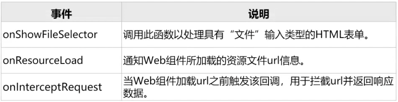 onInterceptRequest事件:当Web组件加载url之前触发该回调,用于拦截url并返回响应数据。