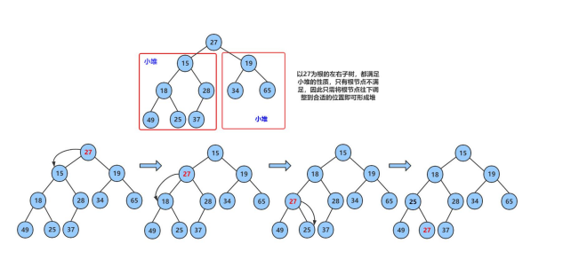 1.我们比较容易想到的是先上调整建堆,假设我们有一个空二叉树,我们可以不停地对其插入数据,然后向上调整,就可以得到堆啦。这种方法的时间复杂度为O(n*log2n)