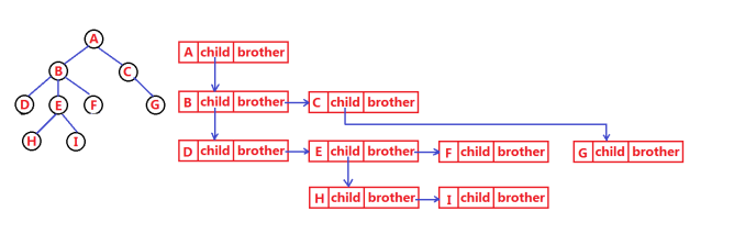 2.采用左孩子右兄弟表示法,对于每个树的结点存储指向孩子的指针和指向兄弟的指针。这是一个非常厉害的表示方法,不管一个结点有几个孩子,我们只需要两个指针就可以表示它的所有孩子。