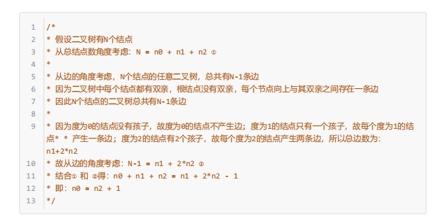 对任何一棵二叉树, 如果度为0其叶结点个数为 m, 度为2的分支结点个数为 n,则有 m=n + 1
