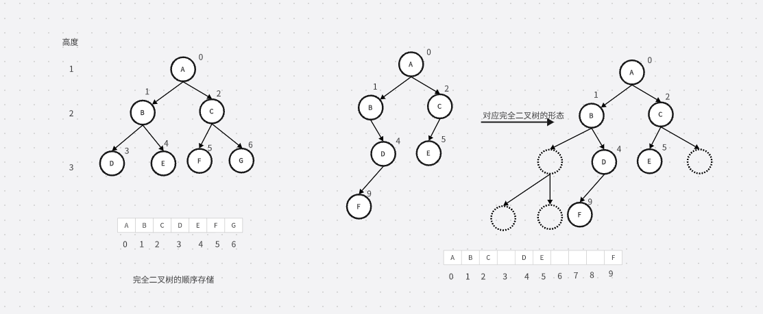 顺序结构存储就是使用数组来存储,一般使用数组只适合表示完全二叉树,因为不是完全二叉树会有空间的浪费。而现实中使用中只有堆才会使用数组来存储,关于堆我们后面的章节会专门讲解。二叉树顺序存储在物理上是一个数组,在逻辑上是一颗二叉树。