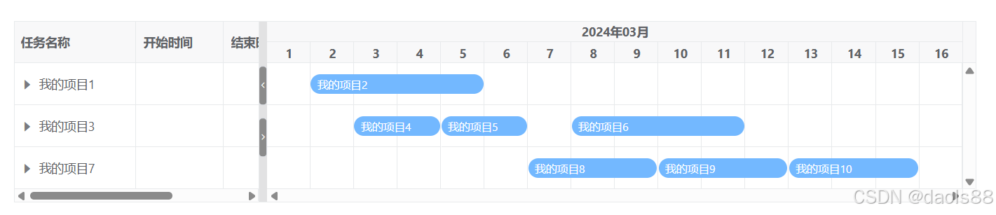 { id: 10002, parentId: 10001, title: '我的项目2', start: '2024-03-02', end: '2024-03-05', progress: 70 },