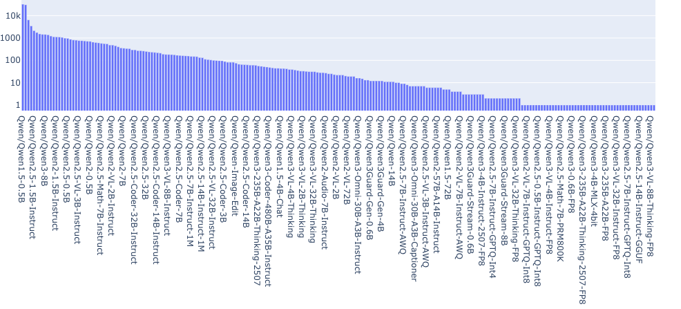 参数规模在 5 亿到 300 亿之间的模型更容易在本地运行、进行微调,并集成到业务系统和智能体工作流中。例如,在 Qwen 系列中,Qwen 1.5-0.5B 拥有最多的衍生模型(见下图)。在算力受限或合规要求严格的环境中,这类模型显然更适合长期运行。与此同时,领先机构通常会使用参数规模在 100B 到 700B 之间的大型 MoE 模型作为能力上限或"教师模型",再将其能力蒸馏到众多小模型中。这形成了一种清晰的结构:顶层是少数超大模型,下层则是大量实用模型。月度统计中小模型占比的上升,反映了社区中的真实使用需求。