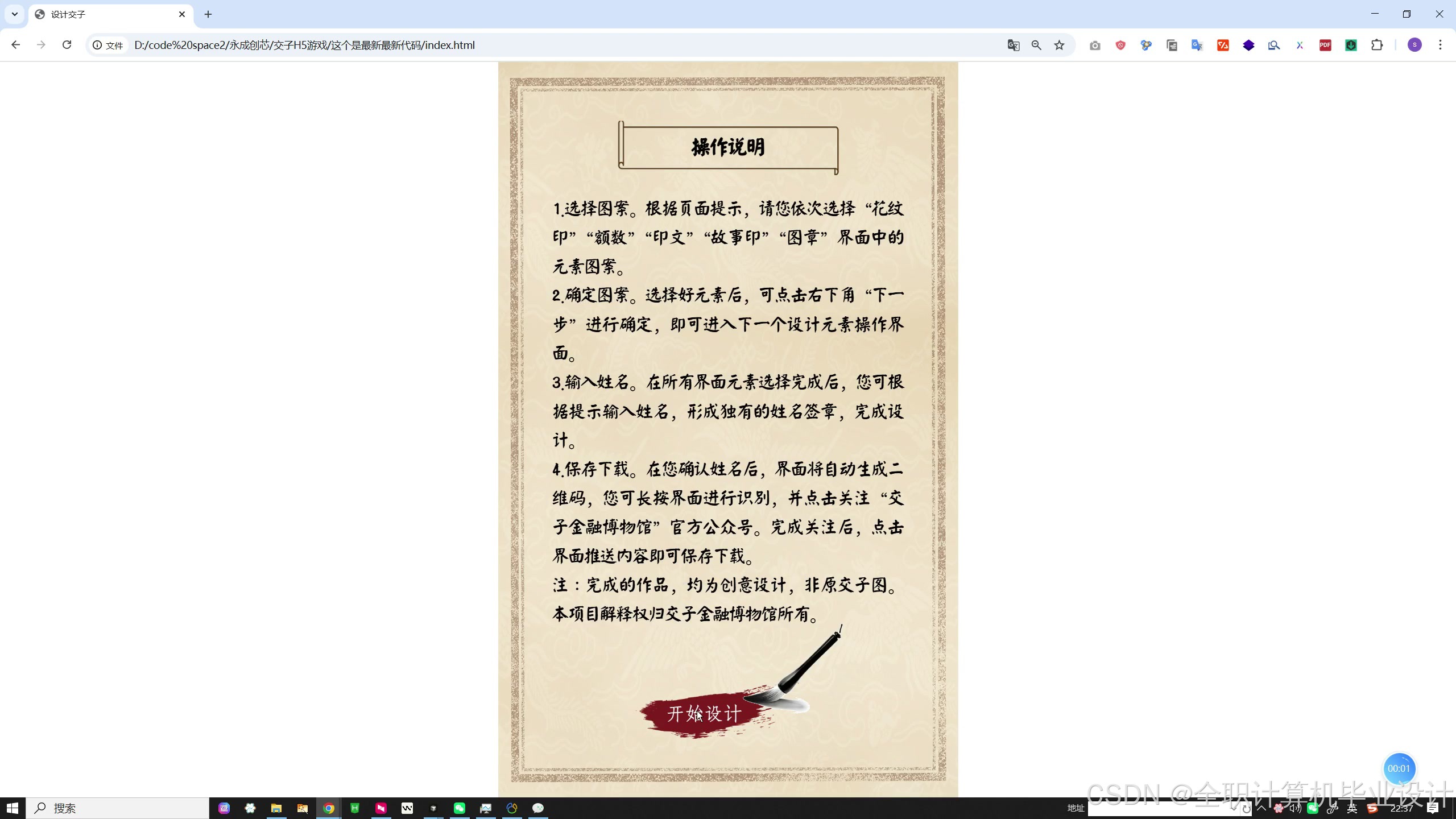这是一款基于H5的交互式设计游戏,让用户通过选择不同设计元素,亲手打造一张独属于自己的古代纸币,体验纸币设计的独特魅力。系统结合传统文化与现代交互技术,让用户在游戏中了解中国古代纸币的历史文化,并通过个性化设计创作专属纪念作品。