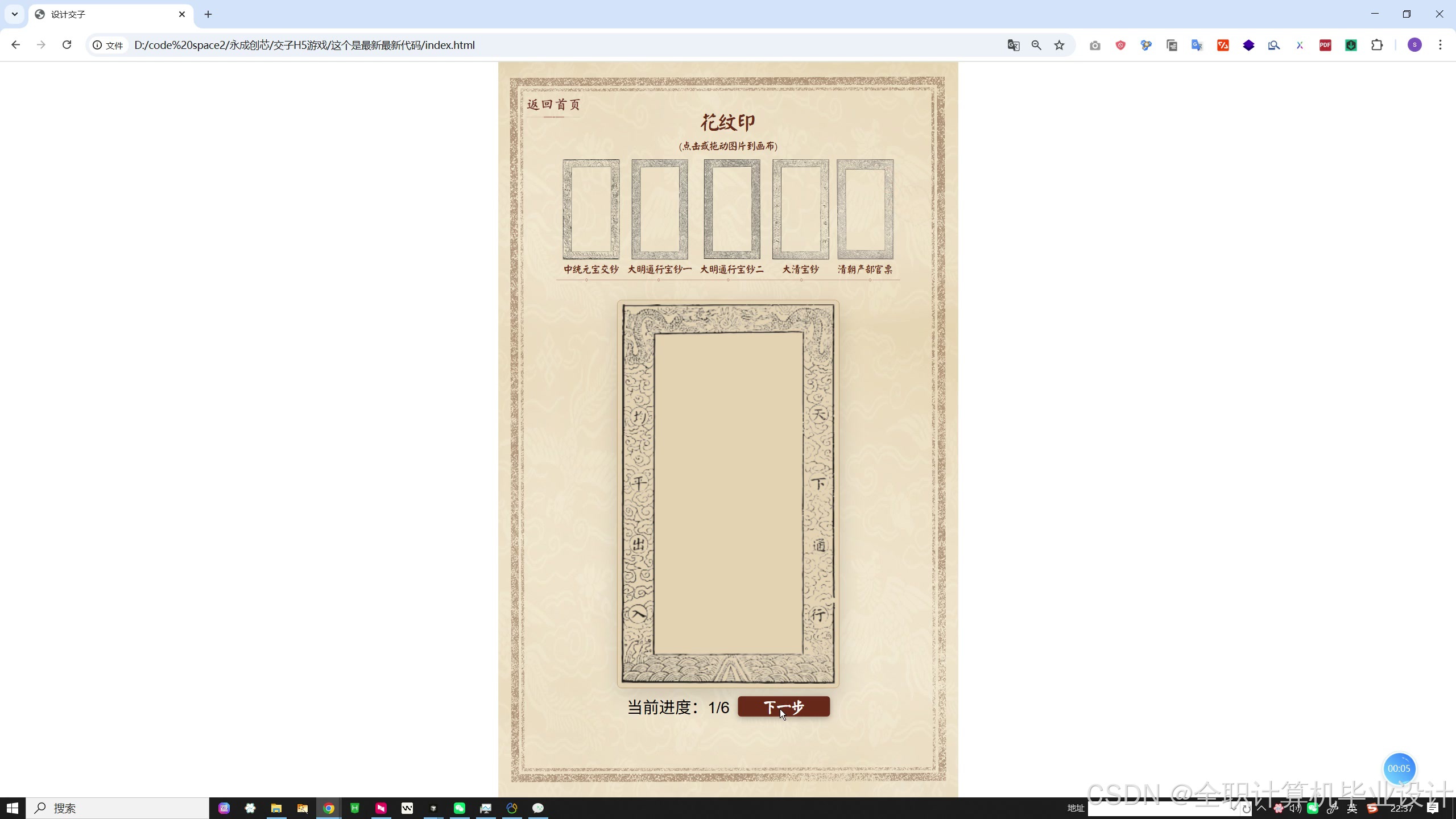 本项目是一款以中国最早纸币「交子」为题材的H5交互设计游戏,面向博物馆展览、文化传播与公众教育场景。用户可在手机或电脑上,通过可视化选择与拖拽,一步步完成「花纹印、额数、印文、故事印、图章、姓名签章」等元素的设计,最终生成一张带有个人签章、可保存下载的「专属古代纸币」创意作品,在趣味互动中了解交子文化与古代纸币元素构成。