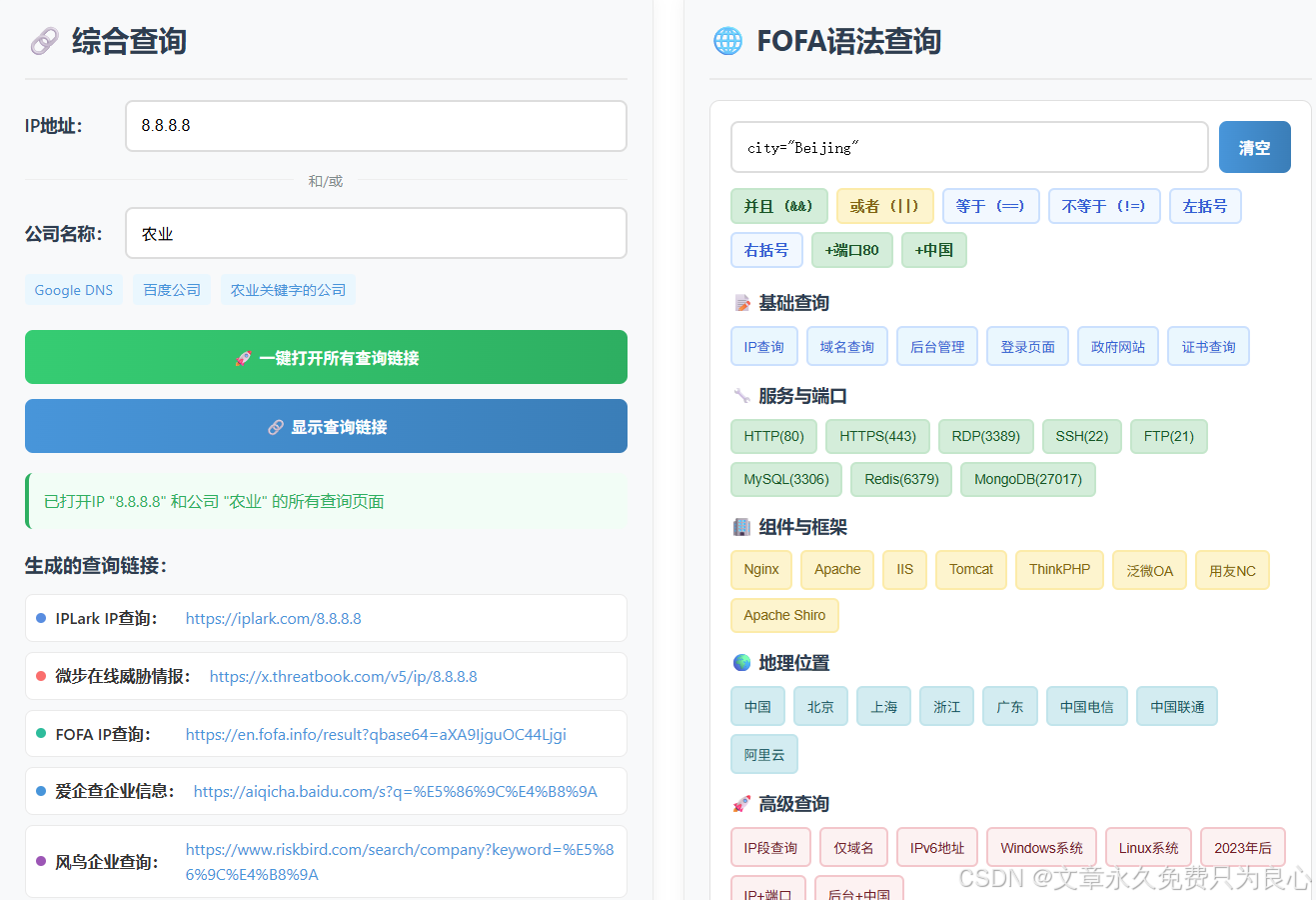 - 综合查询模块:支持IP地址与企业信息的一键多平台查询