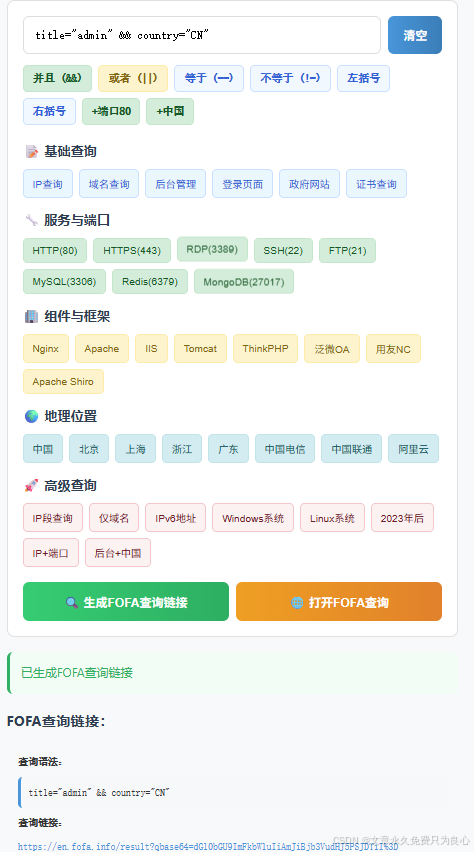 - FOFA语法查询模块:提供丰富的FOFA查询模板与智能语法组合功能