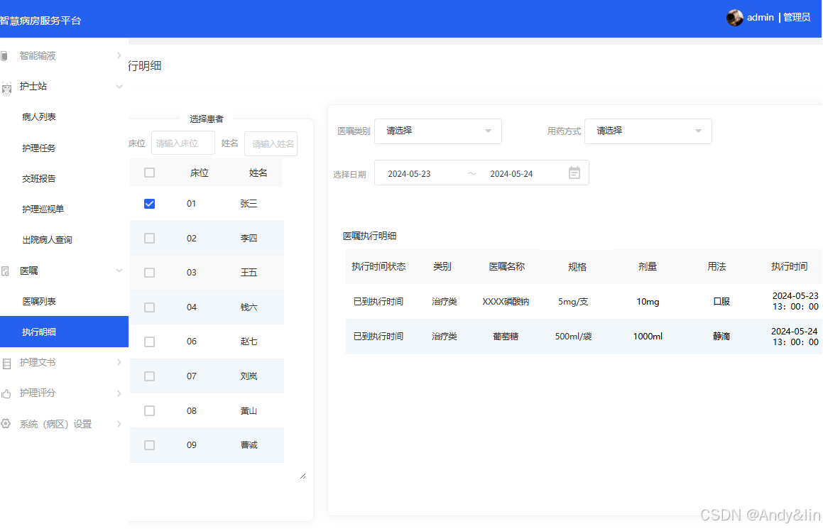 护士站:包括病人管理、护理任务、交班报告、护理巡视单、医嘱执行单、输液巡视单和出院病人查询