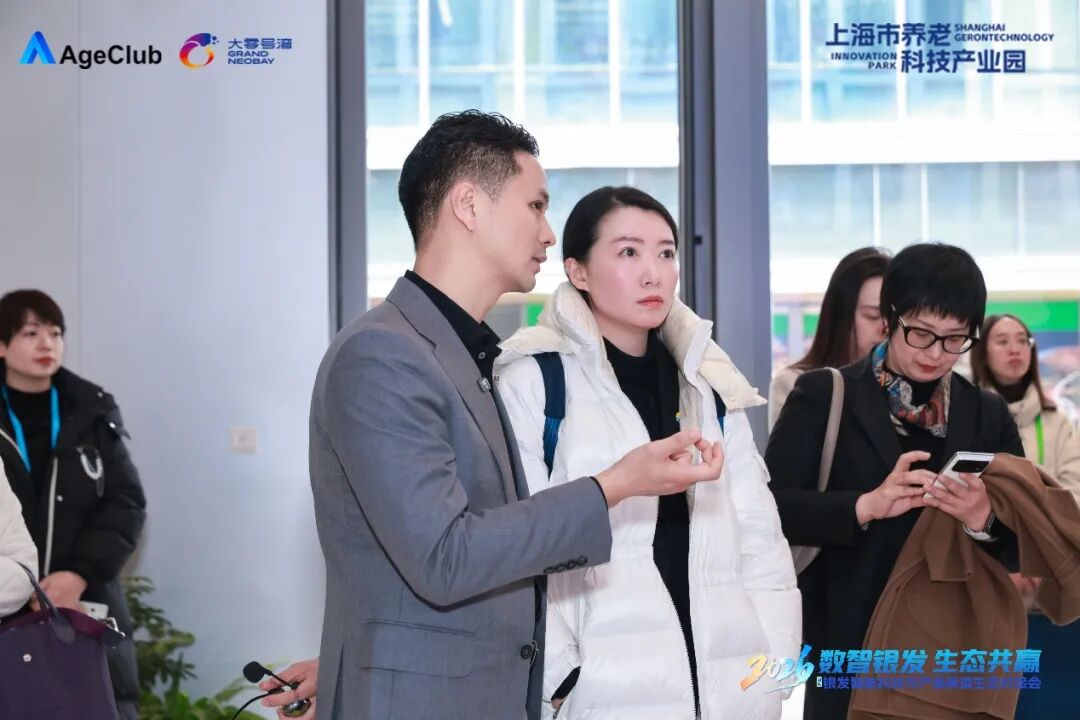 活动现场设置"银发智能科技创新产品巡展",供与会者实地体验最新科技产品。上海大零号湾养老科技发展有限公司总经理柏乐引导嘉宾参观产业园展厅,展示园区载体与产业生态。
