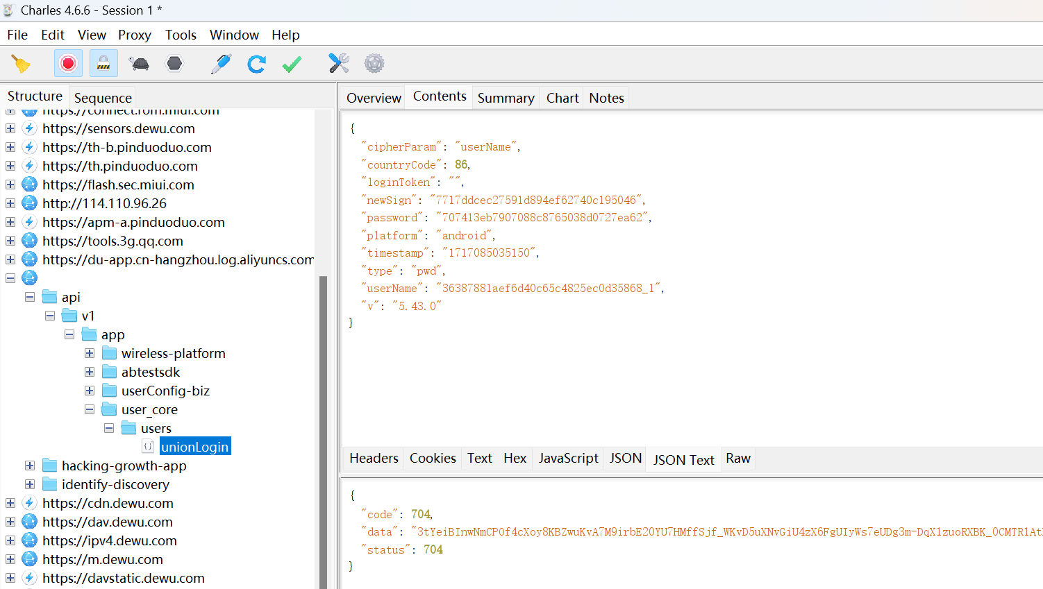 打开 App,输入手机号和密码,点击登录,可以看到调用了 unionLogin 接口: