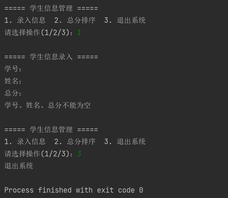 print("1. 录入信息 2. 总分排序 3. 退出系统")