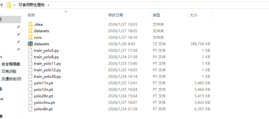 随着人工智能技术在农业、生态保护及户外安全领域的深度渗透,可食用野生植物的快速精准识别需求日益迫切。野生植物种类繁多,部分有毒品种与可食用品种形态相似,传统人工识别方式效率低、误差大,难以满足批量识别与实时应用场景。为解决这一痛点,本文构建了一套高质量可食用野生植物数据集,并基于YOLO系列多个主流版本模型完成训练与优化,通过大量实验验证模型性能,为可食用野生植物识别任务提供可靠的数据支撑与技术参考。本次研究累计爬取并整理5000+可食用野生植物相关数据,经过筛选、标注与划分后,完成多版本YOLO模型的全流程训练,下文将详细阐述数据集构建细节、模型训练过程及最终成果。
