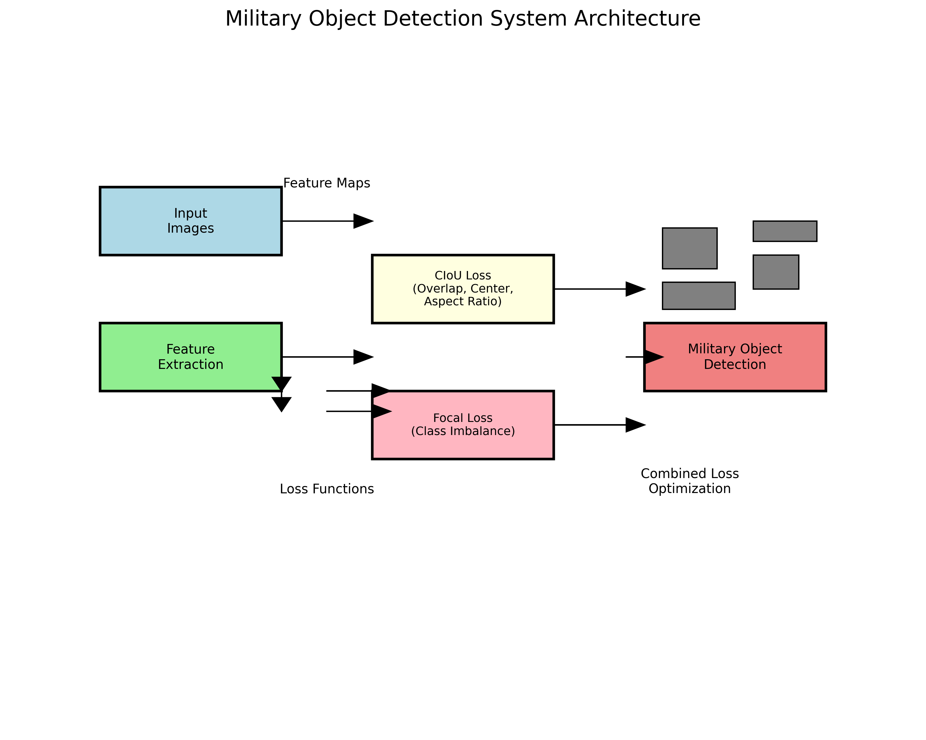 损失函数的设计对军事目标检测尤为重要。我们使用CIoU(Complete IoU)损失替代传统的IoU损失,它考虑了重叠区域、中心点距离和长宽比三个因素,更适合军事目标这种形状多变的检测任务。同时,引入Focal Loss解决正负样本不平衡问题,特别是在小目标检测方面取得了显著效果。