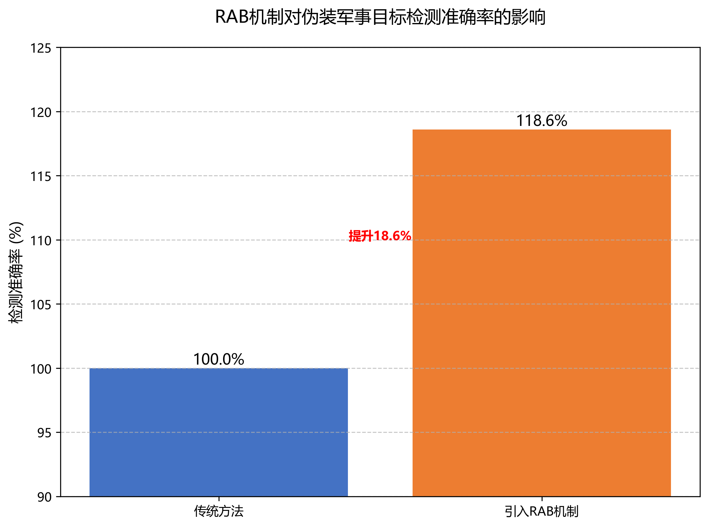 实验表明,引入RAB注意力机制后,模型在复杂背景下的误检率降低了约15.2%,特别是在植被、建筑物等复杂纹理背景中,目标区分度显著提升。这是因为RAB能够自适应地学习航拍图像中军事目标的独特特征模式,有效抑制背景干扰。