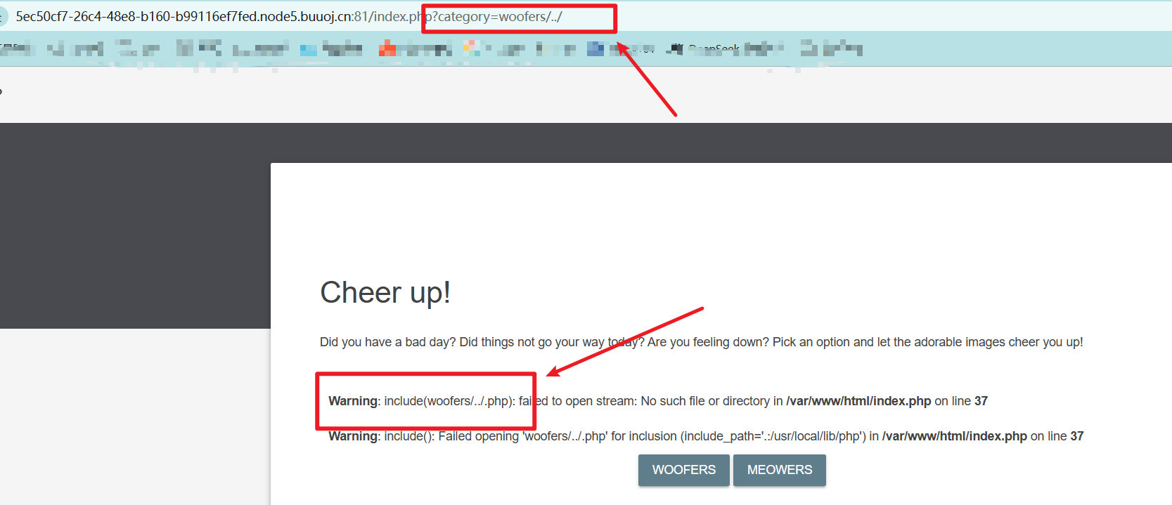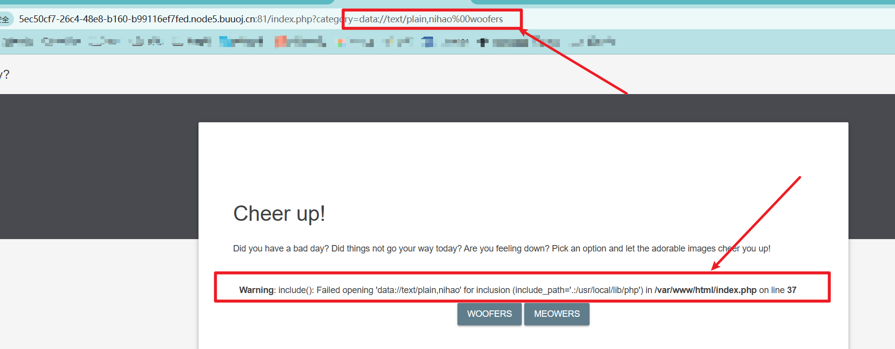 查看flag.php文件,由于查看的路径中必须包含woofers或则meowers,所以可以使用下面两条参数,都可以: