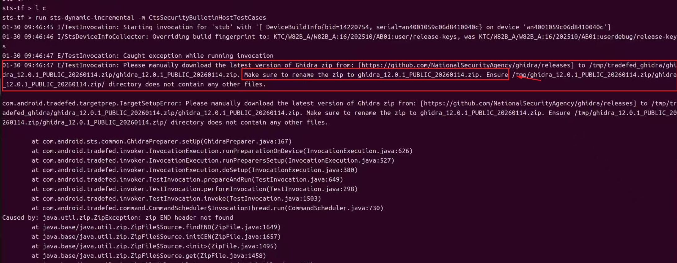我刚开始没注意查看报错就是把 ghidra_12.0.1_PUBLIC_20260114.zip 放到 tradefed_ghidra 目录下面;