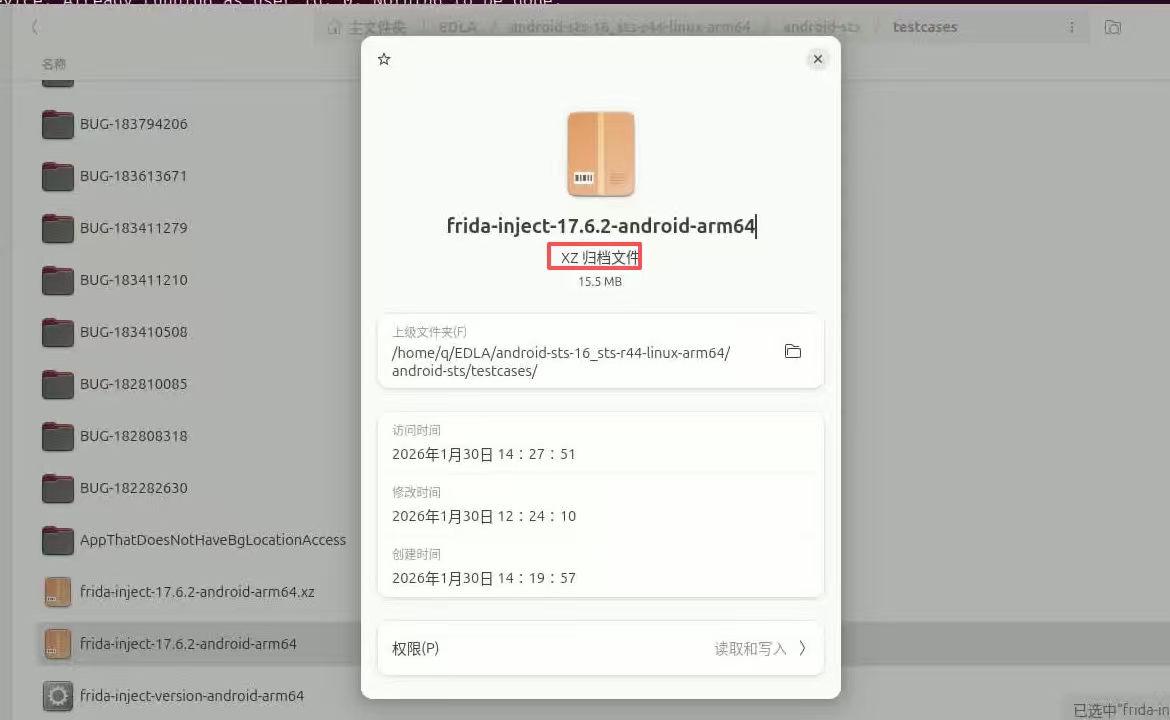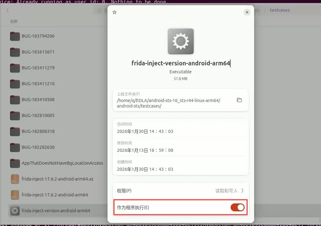 根据提示,下载完后把该文件放到android-sts/testcases目录下,并且重命名为frida-inject-version-android-arm64。