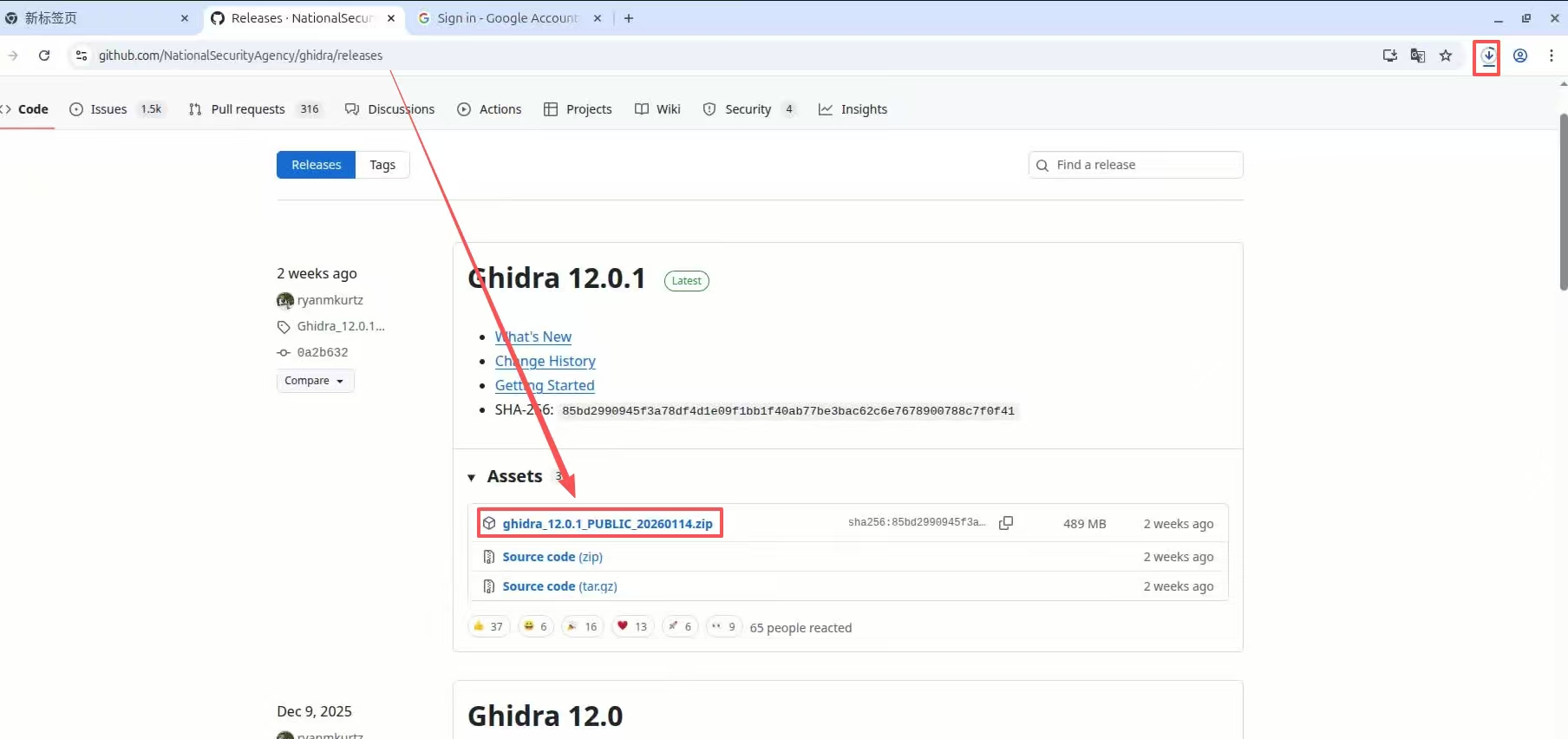(2)根据要求下载 ghidra_XXX_PUBLIC_20260114.zip 文件