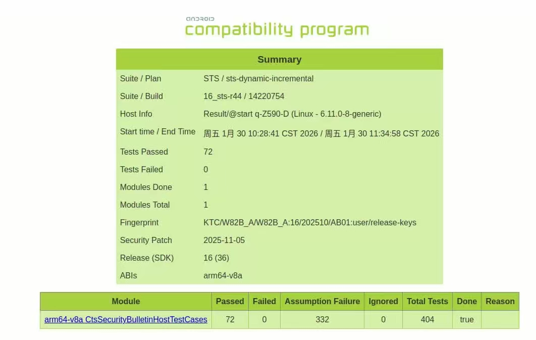 | VTS | 内核测试、Vulkan 图形性能测试,验证 3D 渲染兼容性 |