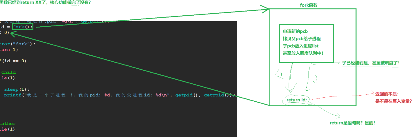 当fork被调用时,操作系统创建一个新的进程控制块(PCB)和地址空间,复制父进程的代码、数据和堆栈。子进程获得父进程资源的副本,包括打开的文件描述符、信号处理程序和环境变量。