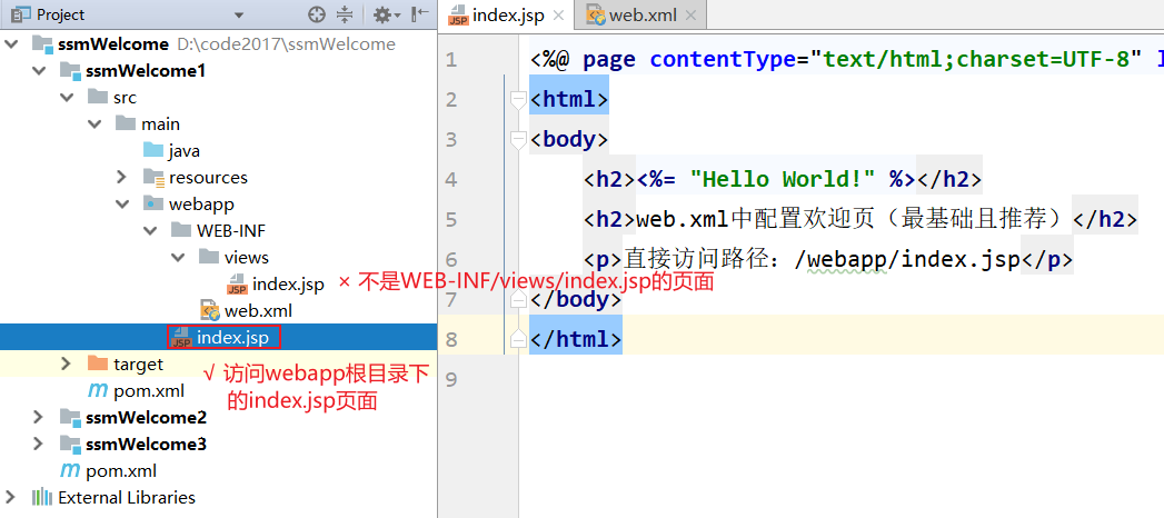 注意:- 访问的是 webapp 根目录下的 index.jsp 欢迎页,不是 static/ 或 **WEB-INF/**下的
