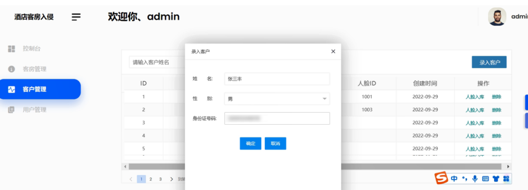 通过录入客户界面可以新增对应的客户信息,包括姓名,性别以及身份证号等基本内容,通过时新增的客户可以通过人脸入库的操作来帮助实现客房端的刷脸进入的操作