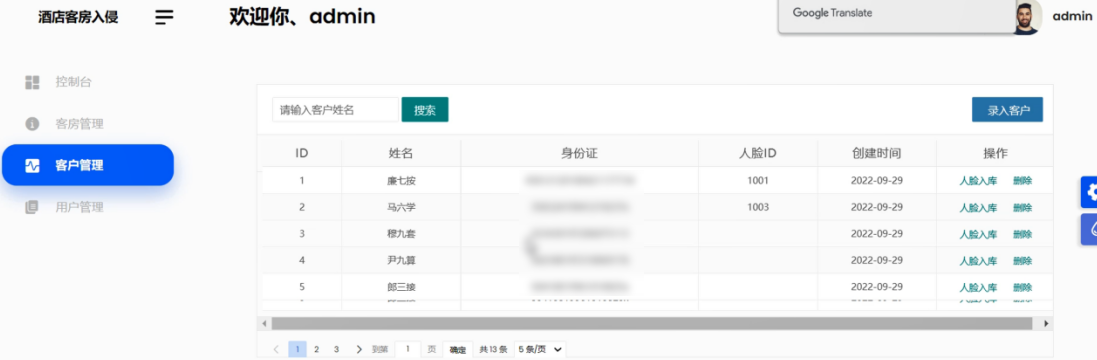 客户的管理主要包括了ID,姓名,身份证信息,人脸ID等内容,为了方便查询客户信息可以通过输入客户姓名点击搜索来查找对应客户,同时可以结合录入客户来实现客户信息的新增录入,客户管理数据与客房管理数据相统一,可以通过客户信息的管理和维护来实现客房前端的刷脸开门等功能