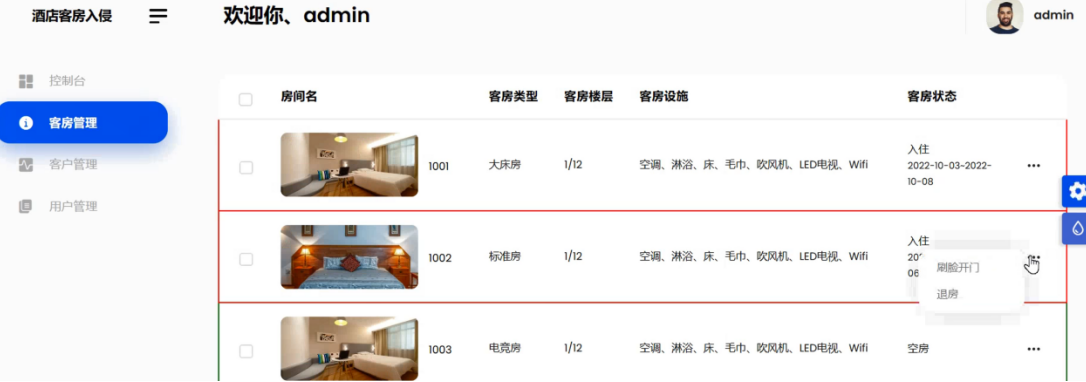客房管理的数据信息统计主要包括了房号、客房类型、客房楼层、客房设施以及客房状态,对于客房状态的信息主要包括了入住和空房两种状态,对于已入住的客房可以实现刷脸开门和退房两个功能,具体客房管理数据呈现界面如下: