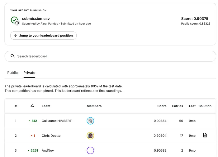 如您所见,TabPFN 开箱即用地表现相当好。虽然 XGBoost 当然可以进一步调优,但我的意图是比较 基本的原始实现,而不是优化模型。它让我在公共排行榜上排名第 22 位。以下是前 3 名分数以供参考。
