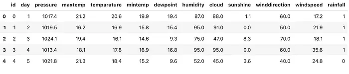 为了更好地了解 TabPFN 在实际环境中的表现,我在几个月前结束的 Kaggle Playground 竞赛中对其进行了测试。任务 使用降雨数据集进行二元预测 需要为测试集中的每个 id 预测降雨概率。评估使用 ROC-AUC 进行,这使得这很适合像 TabPFN 这样的基于概率的模型。训练数据如下所示:
