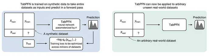 在训练期间,采样一个合成表格数据集并分为 X train 、Y train 、X test 和 Y test 。Y test 值被保留,其余部分传递给神经网络,该神经网络输出每个 Y test 数据点的概率分布,如左图所示。
