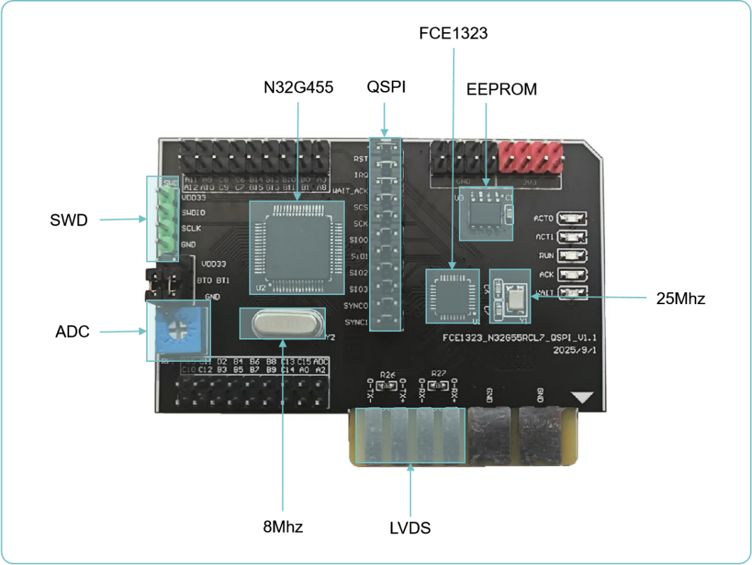 基于自主研发的 EtherCAT 从站芯片 FCE1323与N32G455RCL7所设计功能板,主要由以 FCE1323 为通信核心,搭配国民技术 N32G455RCL7 主控 MCU,形成 "通信 + 控制" 的全国产完整硬件架构,功能板依托背板方案底板进行测试,通过 FCE1323 的 SQI 接口与 MCU 实现高速数据交互。板上同时保留 SWD 接口用于程序烧录与调试。以便帮助工程师节省底层硬件搭建工作,加速功能验证与调试,提升研发效率。