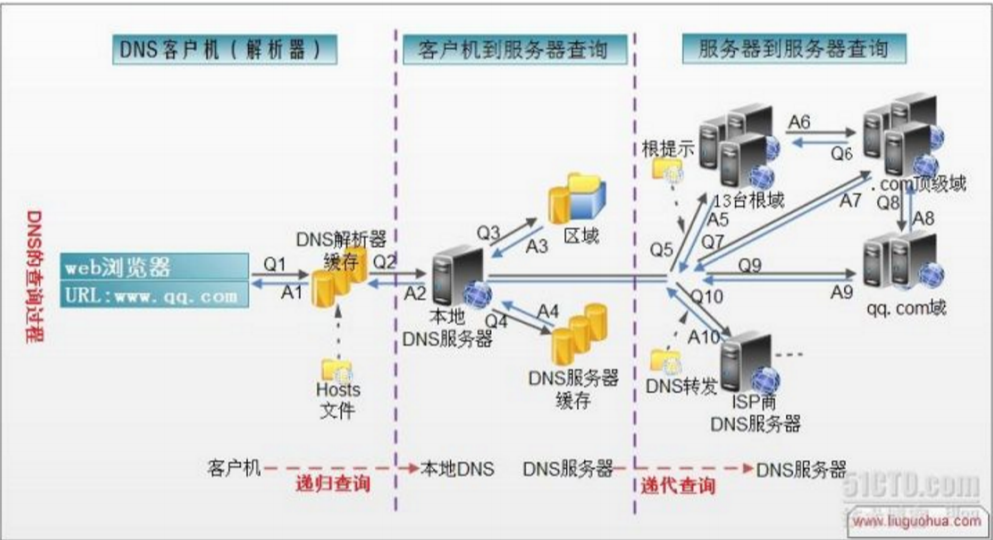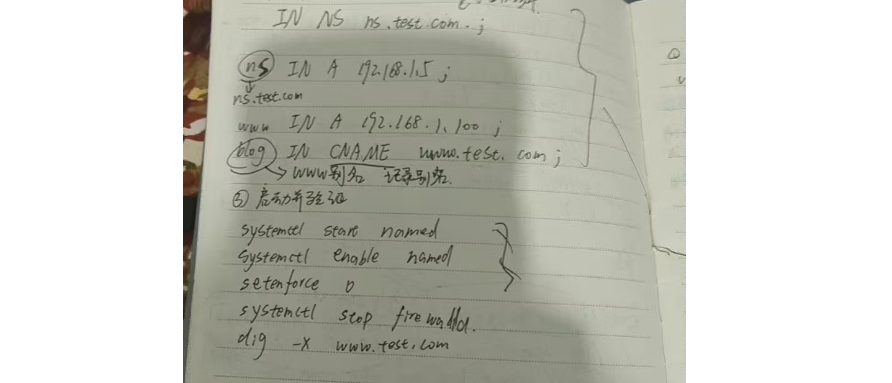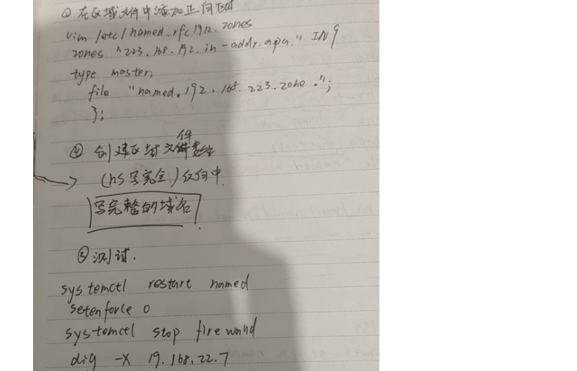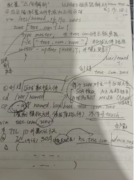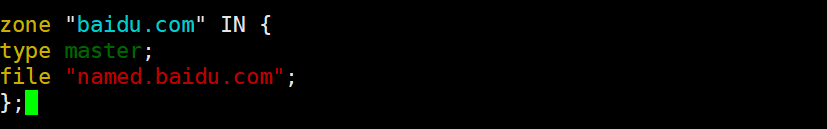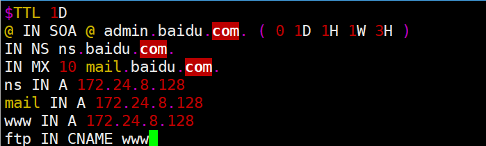 root@localhost \~\] # yum install bind -y  \[root@localhost \~\] # rpm -ql bind /etc/named.conf # bind 主配置文件 /var/named/slaves # 从 dns 服务器文件夹 \[root@localhost \~\] # vim /etc/named.conf options { # 定义监听端口,如果所有地址都监听,则只写端口 listen-on port 53 { 127 .0.0.1; }; listen-on-v6 port 53 { ::1; }; # 定义数据文件目录 directory "/var/named" ; # 只允许本地主机进行查询 allow-query { localhost; }; }; # 定义区域 zone "." IN { type hint; file "named.ca" ; }; 实验 1 :配置 DNS 正向解析 \[root@localhost \~\] # vim /etc/named.conf options { # 定义监听端口,如果所有地址都监听,则只写端口 listen-on port 53 { 127 .0.0.1; }; listen-on-v6 port 53 { ::1; }; # 定义数据文件目录 directory "/var/named" ; # 只允许本地主机进行查询 allow-query { localhost; }; }; # 定义区域  \[root@localhost \~\] # vim /etc/named.conf 主配置文件 options { # 监听端口为 53 ,大括号内数据内容可以为 any listen-on port 53 { 172 .24.8.128; }; directory "/var/named" ; }; vim /var/named/named.baidu.com    2.反向解析