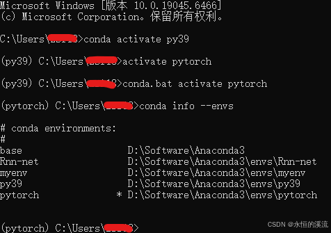 1.输入conda activate py39命令激活py39环境并进入后,输入activate pytorch命令激活pytorch,发现pytorch存在。