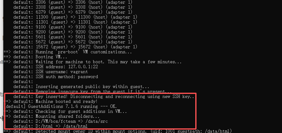 Machine booted and ready!,可通过vagrant ssh正常登录虚拟机。