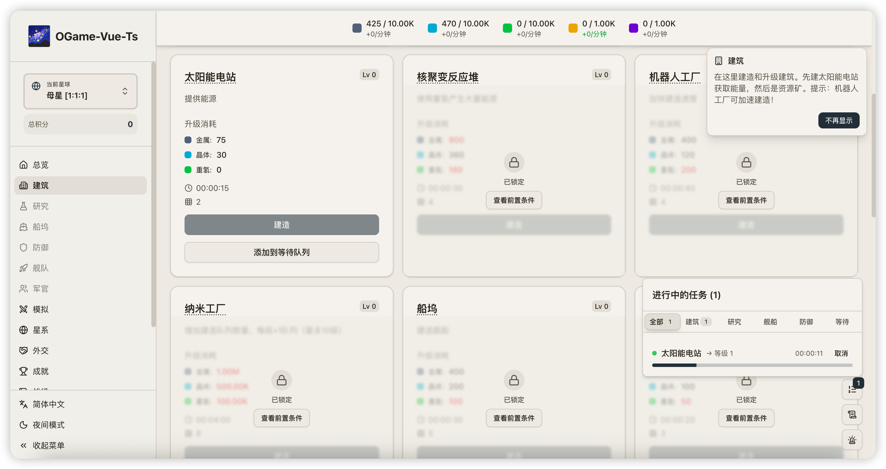 ogame-vue-ts 是一款基于 Vue 3 和 TypeScript 构建的单机版浏览器太空策略游戏,受经典 OGame 启发,支持在浏览器中建立太空帝国、研究科技、建造舰船与防御设施、参与太空战斗。