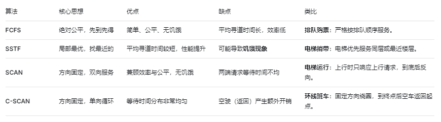 - 磁盘调度算法比较:能根据寻道序列计算不同算法的磁头移动总道数,并理解其优缺点。