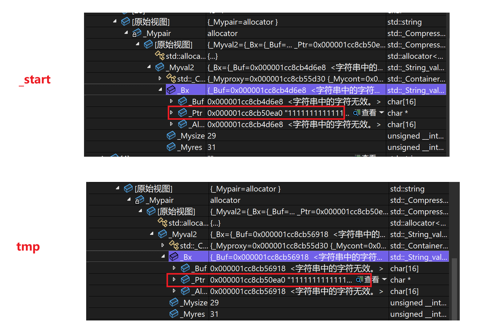 这里观看监视窗口,可以发现他们的地址是一样的,当_start资源释放的时候,tmp也会销毁;
