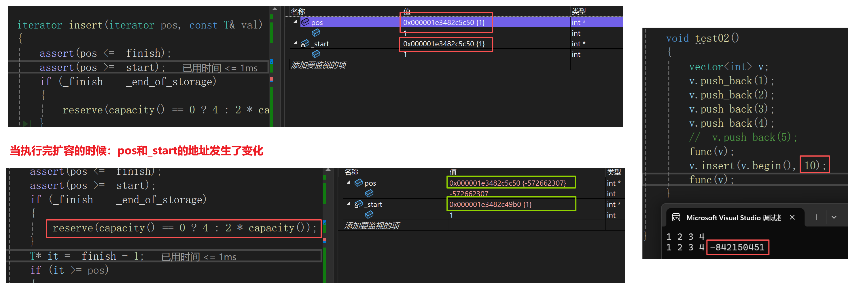 执行5次是正常的,但执行4次却有问题,那么可以推断问题出在扩容上面,于是调试代码发现,_pos和_start在执行完扩容之后,地址不一样了,但是我要在pos位置插入数据,而新空间的地址和pos不一样,这不就是非法访问了吗?