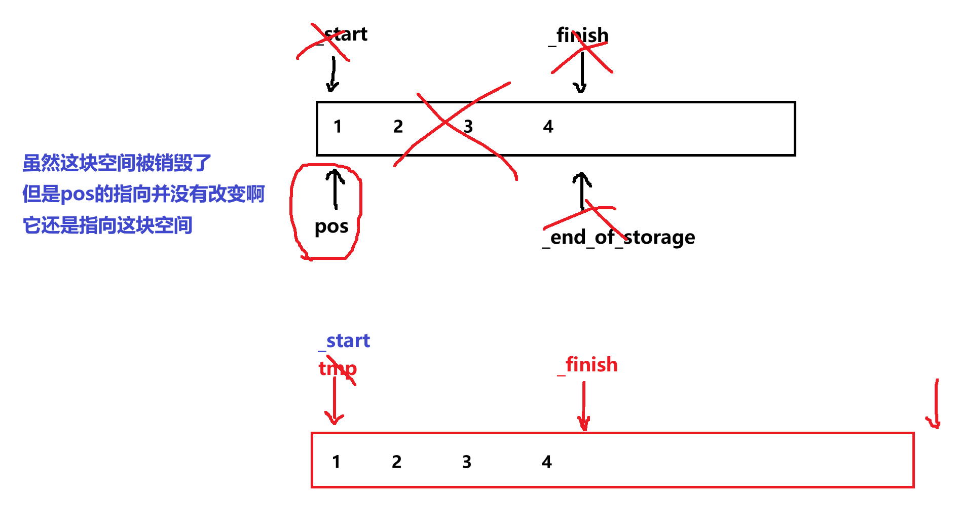 我们知道,当扩容的时候,会释放就空间,并更新_start,_finish,_end_of_storage,但是你并没有更新pos的位置,也就是说pos还愣在那里嘞,此时再对pos位置进行写入,不就是非法访问了,所以这里的主要问题就是更新pos。