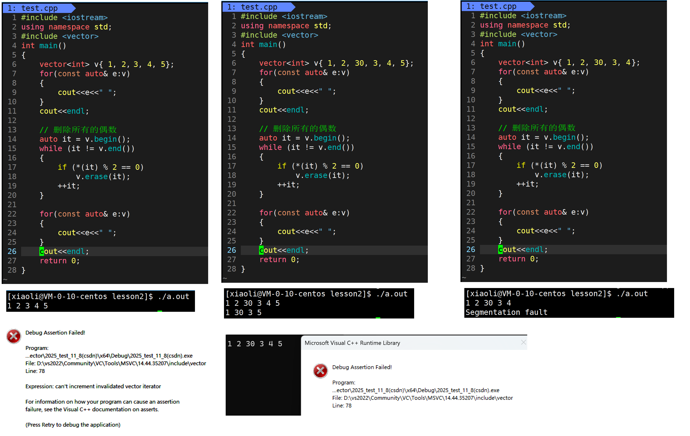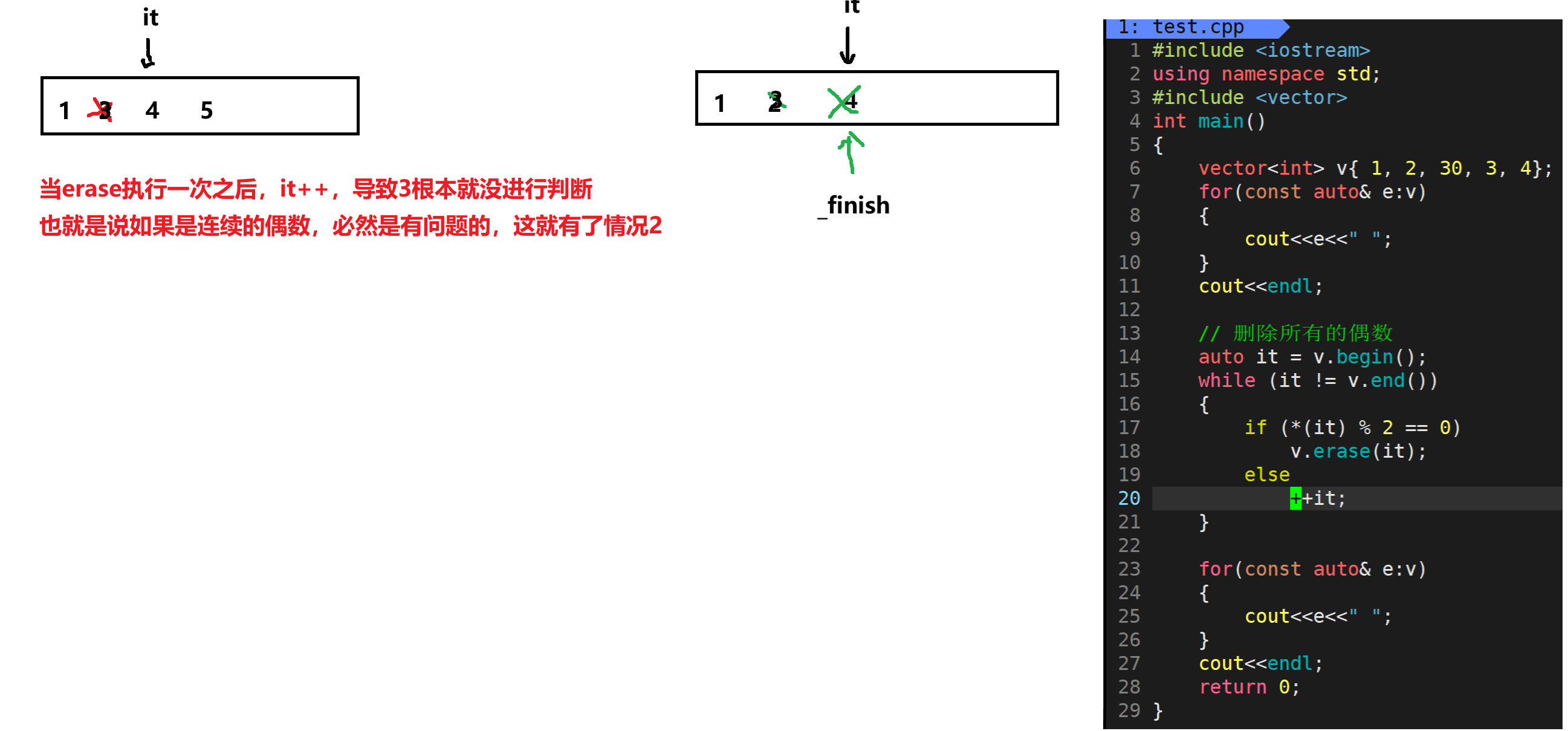 就比如第一种情况:迭代器失效(右侧是修改的代码)