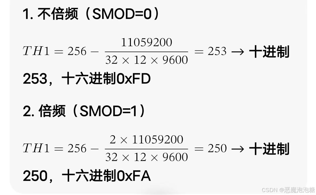 当晶振频率是11.0592MHZ,串口方式1,定时器1方式2,波特率是9600分别计算倍频和不倍频举例: