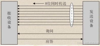 特点:控制简单,传输速度快,但由于传输线比较多,长距离传输时成本高,接,收方存在困难,抗干扰能力差。