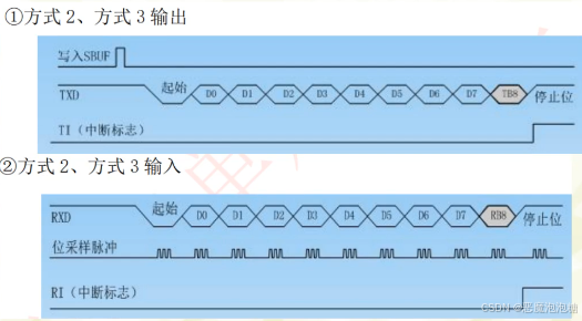 一帧数据的格式:起始位,9为数据,停止位,一共11位。其中起始位和停止位和方式1类似,不同的区别就是数据多了一位,增加了一位,它是9位,最后第九位数据是,RB8/TB8。