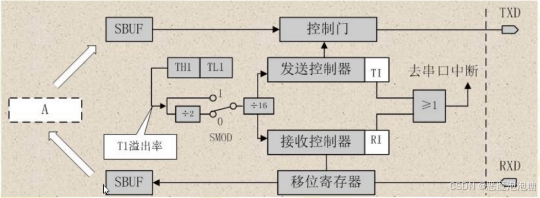 SMOD通过对应的寄存器控制它的倍频,如果不倍频开关打到1状态,如果是倍频则开关打到0的位置上,对应的值除以2, 在传送到我们对应的接收和发送控制器中,接收和传输控制器,是通过SBUF控制控制门和移位寄存器。