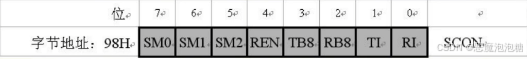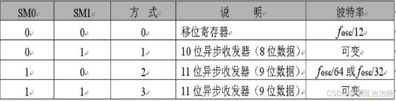 SCON寄存器中有8位,前面两位SM0和SM1用来确定串口的工作方式,它有四种方式,通常是使用方式1,。