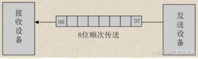 使用一条数据线,进行传输,将数据字节分成一位一位的形式。先传输低位,后传输高位,从低位到高位,这样一位一位的将一个字节八位传输过去。
