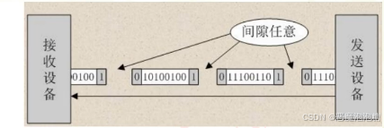 特点:不要求收发方时钟严格一致,就比如说,发送设备的频率是11.0592M,并不会一定要求接收数据的设备的时钟也是11.0592M,有一点点误差也是允许的,实现容易,设备开销小,但是每一个字符附加2~3位,用于起始位,校验位,停止位,各帧之间还有间隔,因此传输数据效率不是很高。因为数据与数据之间存在间隙,这个间隙的时间是任意的,因此传输的效率就不会很高。