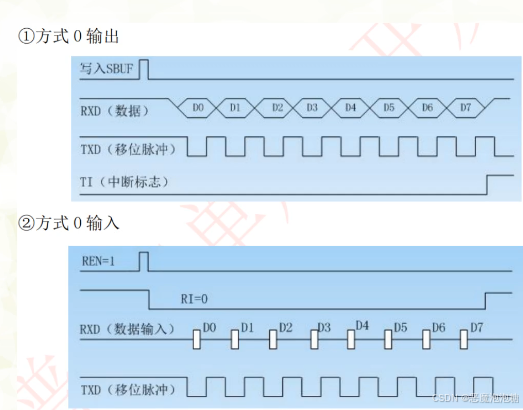 输入:通过RXD进行接收的,在脉冲采样上面一个接收,首先接收一个低电平,然后八位数据,从低位到高位,最后是高电平的停止位,接收完成后,RI由硬件设置1,发送中断请求,进入中断,需要我们手动将RI设置0。