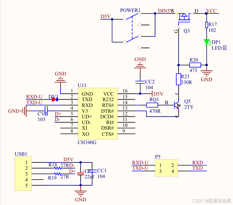 RS232逻辑电平-3V~15V 还有3V ~ 15V需要电平转换芯片MAX232芯片,但是在图中并没有看到,而是使用了USB转换芯片,CH340芯片,跟串口进行转换。